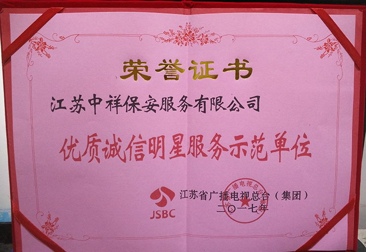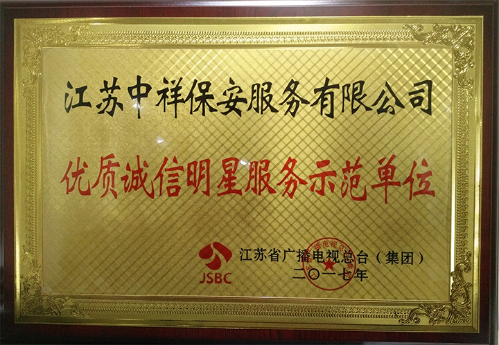 中祥保安公司榮獲江蘇省廣播電視總臺2017年優(yōu)質(zhì)誠信明星服務(wù)示范單位